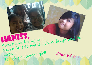 Below are the picture of my JUNIOR, that i MISS like so badly so let me name them. 1) there is Atiqah 2) Izza 3) Syara Feyna 4) Meera Afini 5) Finaa I badly miss my junior lah. hope to see them pretty soon... Life have been rather average ths week. class bbq so excited can see my classmate lah... like finally and long time didnt see them. going to get my new hp on 12 december. going to rebond my fringe on 15 december. going malaysia soon. going to renew my passport after 15 december going to start my maths tuition on 21 december (excited) going to do all my assignments by this week. going by books soon. and a lot more. that have to be done by the end of december. You stabbed/killed me with a knife yesterday. causing me to lose a lot of blood. i thought i was dead at that moment of time, but i did not i am still alive. i lost my blood for you but i will still love you. D coach me with my maths yesterday thru sms and sms a lot with him, we r okay i guess.. fun msg-ing him yesterday and today in the morning. ![]() ![]() ![]() ![]() ![]() Labels: your feeling so deep inside Sunday, November 29, 2009 ![]() Been like 2days didnt update and i am sorry. hmm long post heere, i think idk... 27.11.09: Hari Raya Haji headed to Both Grandma House One At Jurong West St 81 And Then other one At Tamppiness. Bla2 Take picture, and will upload it AT FB. nothing much happen, but totally laugh a lot with crazy uncles. 28.11.2009: Woke up at 10.20am and do stuff and then bath and then went out with sister, Hidayah. Cabbed diwn to Jp to do UOB Card fr sister, Nadiah. Then arnd 4 trained down to orchard. First we went to Takashumaya, then to Wisma And then to tangs, to Far East Plaza and then to tangs and then to taka/wisma and then lastly to ION orchard. Then we trained home arnd 10.30pm. we reached home arnd 11.30pm. I bought biker jacket, 2 pairs of shoes And one shirt. And of cuz my teddy bear. Had fun but then tiring. Was a blast. Ok then had a great sleep cuz i was tired ah...:) 29.11.2009: Happy Birthday Haniss. Sorry for the posy. I was just throwing my anger when i saw wht u said at ur post and idw anymore fights, Just let bygones be bygones. Then woke up at 8.45am talk to sister. Both suster hidayah and nadiah were off to work left me alone. didnt had breakfast today. Took a bath at 9.55am and get ready today, wpre a long skirt a shirt covered with biker jacket. Then took 172 and met with Syahfurah at sunshine bus stop, Then we headed to madrasah with our home clothes to take our report book. saw my fav.ustazah today my ft so happy ah hehe^^.... Got 5th in class this year. Every year cobfirm get 5th in class at madrasah. i want get 3rd cannot. Only last year i get 4th, gonna work hard. Nothing much happen, updated today so wont be updatin so often ths time, gonna finish up with assignments.. Going to get D to help me with assignments thru sms or msn. toodles.... You were all by yourself Staring up at a dark grey sky, I was changed. In places no one will find the feeling so deep inside. In your eyes can see everything i hope we changed but i am asking just too much for us to chnge. 33days not contact-ing you.AMAZING!!!=( Labels: It lasted forever and ended so soon Thursday, November 26, 2009 ![]() Hey haniss, i saw what you wrote at ur post. And sorry if this hurt you.!! But i didnt meant too ur recent post where there is syuhaidah's name and gang. Okay, we are nt happy when you cancel our plan, but we r a bit angry okay. We are nt happy when u cancel our plan which u alr knw weeks before schl holidays... We have plan so hard fr this fr ur birthday but u cancel. Its ur desicion i know. But you don't have to say that maybe syuhaidah and gang are happy whtsoever. we are not!!! Whatever shit ur desicion is we respect, but when we ask u or we sms you if you know tht we are going to ths place you say you dk whtever shit.. Okay idw elaborate more, but i wht to say dun ever judge us and say tht we r happy etc. idk if i shld use the word guilt to you... but whtever it is, you crushed our plan away... Whtever ah i am tired of all this.. you can celebrate with anyone you want, but the only thing i can say is that do not judge us, see who ur true friends are.!! Exactly 30days i didn't contact you which is already a month. I wish we didnt have to do this, we are still lying to each other when we say we want to start afresh, but NO!! We are still lying, we are lying cuz we r still angry at each other. Why must this happen, i just can't simply frget you just like tht. All the memories are still inside my heart. Be it bitter or sweet. I hope things will change soon. Oh btw thx fr helping me in my maths although its thru sms..=) Thank you i really do appreciate it. Labels: Only Hope Wednesday, November 25, 2009 Hey there, life ah average... I feel so excited on 28.11.2009 My pm got right, But sadly in less thn a month time i will start my maths tuition.. while evrybody still enjpyingt heir holidays, i am stuck with tuition and maths here i come again!!=) suddenly i am excited on maths cuz i really want to do well and score well and get like 75 marks. Oh even beat my sis Nadiah who gets 80++ marks fr maths seh.. Haha, will try hard and i will never give up. Assignments: 2 Maths Done English Compre Done Chemistry Done Physics done Left with: Compo Situational writing & Book review. You are back, cool isn't it haha?!! But wont be texting you! I will be busy and have no time for you. Myb aft bbq i will be going to malaysia and going to renew my passport!! So good, going with sister lah!! I want go GENTING lah haha whtever. Okay outtoday, with 3rd sis to jp and Ten mile junction sheng siong. Myb tml out with 2nd sis ciz she off idk, have been going so often now. Its just like my June holiday cool, going finish up my hmwk toodles. ![]() ![]() ![]() Labels: Guide me through Tuesday, November 24, 2009 ![]() I miss my June holidays. Where my 2nd and 3rd Sister always brings me out...!!=) Now my holidays i haev been doing the 